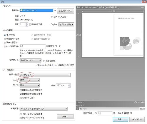 OKI C811 A3対応のレーザープリンターで PDFファイルを製本印刷させる方法の覚書です。 プロパティーの設定 →原稿はA4ですが、用紙サイズをA3に。 →両面印刷で短辺とじに指定。